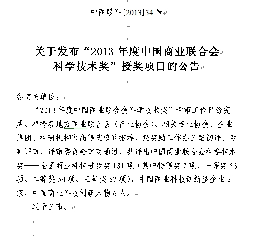 公司《大撓度下鋼筋混凝土板的受拉薄膜效應(yīng)》項(xiàng)目榮獲2013年度中國商業(yè)聯(lián)合會科學(xué)技術(shù)獎——全國商業(yè)科技進(jìn)步獎一等獎。